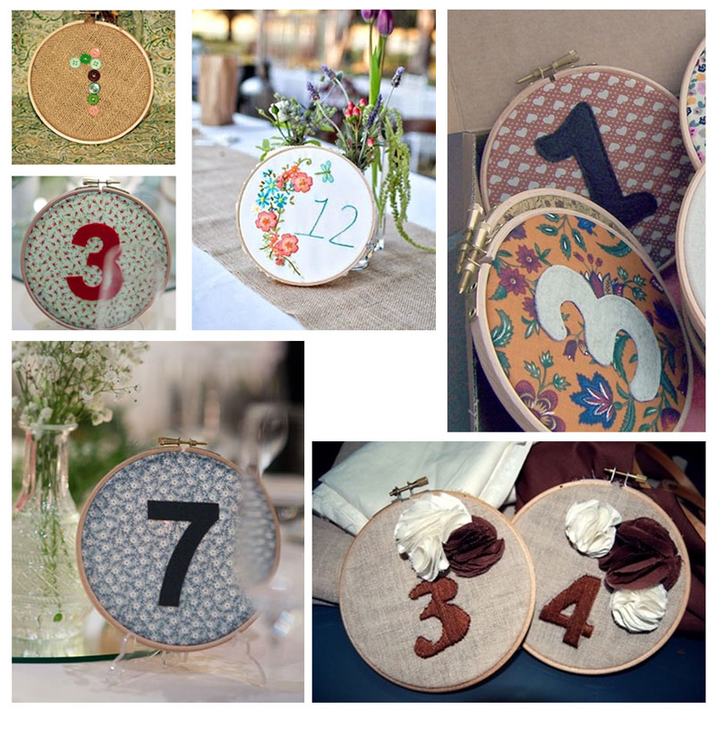 3. Números de mesa bordados en bastidores. Si te gusta bordar y has hecho alguna vez punto de cruz… te animamos a que prepares los centros de mesa en bonitos bastidores!! puedes añadir botones, bordar flores… todo lo que se te ocurra porque quedarán genial en las mesas de tus invitados: